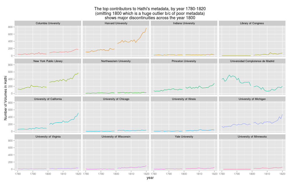 And this isn’t an issue particular to just Bookworm, although it does have a slightly more tangled line of transmission than some other libraries. Here, for example, are the top 16 libraries in the Hathi trust catalog from 1780 to 1820, scraped from their web catalog. 1800 is not a year that dramatically changes the publication history of books; but it is a year that librarians will use for their own arbitrary purposes. For instance, a book published in 1799 is considerably more likely to have been “rare” and therefore off limits to the Google scanners in the period of book scanning, I’d bet anything, just because human beings use rules of thumb like that; or in the period that university libraries were being built, acquisition policies may have been quite different for pre-1800 vs post-1800 texts in various genres. (“Don’t buy any science books written before 1800” would be a sensible policy to adopt in 1870, for example. Almost all the libraries here would not have bought the bulk of their 1799 collections in the year 1799.)